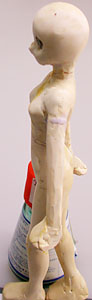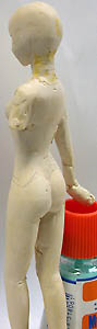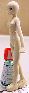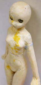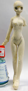 ううーん…『改善』というより『改悪』ていう感じ… 前回のはちょっとおねえさんふうすぎるのではないか? と幼な化計画を実行してみました。 ・骨盤の外側削って腰のボリュームダウン ・肩幅削ってボリュームダウン ・おしりも削ってボリュームダウン てな塩梅で全体的に試行錯誤しつつボリュームダウンしています。大分華奢な感じになったようなそうでもないような。一番右の上から見た写真を見てもらえると随分胸が少なめになったことがわかってもらえるかな。胴は3ミリほどつめてアルテコで接着してあります。大きさは支えのクレオスマスキングゾルを参考に。 でもケズケズしてたら頭の大きさがイマイチよくわからなくなってきて顔が全然きまりません。顔の目の位置もなんかグレイなみに縦長なのでもちょっと削ってみるか…<ループ。そして今回もりんなたんはいないのだった… 現在の原型完成度…9%(2003/09/15)