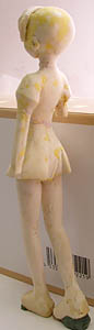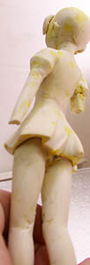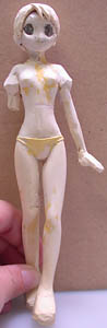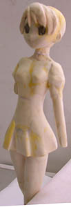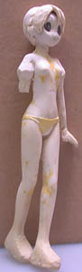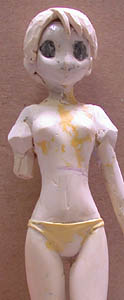 取りあえずボディの形だしをしてみました。スカートや服をもりもりするのでスリム気味にしてあります。ちょっぴりデフォルメの頭でっかち風にしたいな。顔は段々落ち着いてきた感じだけど、ほっぺたとかは納得いかないのでちょいもりしつつ様子見てすすめますー。 そろそろ腰分割にしてスカートもりもり大会予定なのですが、そのまえにパンツ作っちゃおうとパンツもりもり大会〜。パンツのしわ他はポリパテで作ってあります。フレアスカートで余裕があるので、パンツにフリルとリボンをつけてあげようかな なんて思っています。 髪の毛は様子見でぱぱっと作ってみました。これからちょっとづつディティールを入れていきます〜。りゃんめんテープでつけてあるので例によって浮き気味、そして例によって倒れ気味… 現在の原型完成度…13%(2003/10/03)